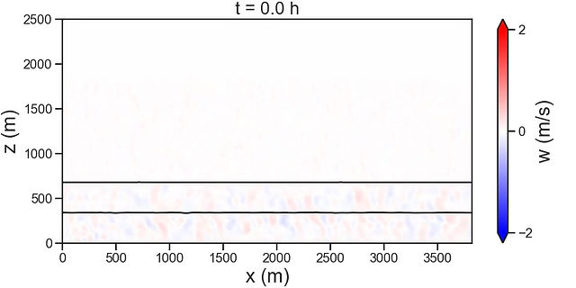 Animation 2: 2D simulation of cumulus shooting into stratocumulus decks during the ASTEX field campaign. Contours mark the cloud condensates. Simulated by System for Atmospheric Modeling (SAM) version 6.11.3. dx = 15 m. dz = 5 to 10 m.